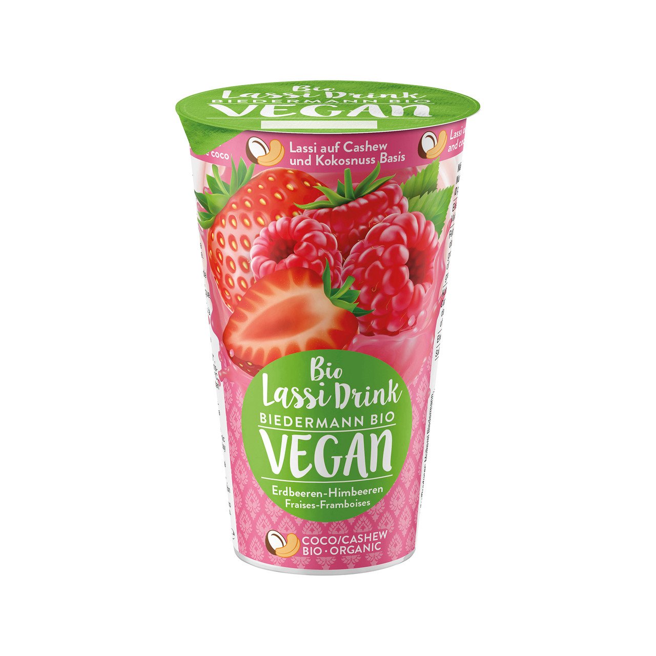 Ein fruchtig süsser Lassi auf Basis von Cashews- und Kokosnuss. Fermentiert. Für den köstlichen Fruchtgeschmack sorgen beste Bio-Erd- und Himbeeren. Hergestellt wird die vegane Joghurtdrink-Alternative in der Schweiz aus zertifiziert biologischen Zutaten.