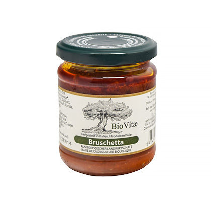 Der Bruschetta Aufstrich von Bio Vitae wird in Italien aus besten biologisch angebauten Zutaten hergestellt. Sonnengereifte Tomaten und frischer Basilikum sorgen zusammen mit nativem Olivenöl und Gewürzen für den typischen Mittelmeer-Geschmack. Der Bruschetta Aufstrich von Bio Vitae ist unser absoluter Liebling. Wir dippen am liebsten feine Grissini darin. Aber er schmeck auch himmlisch auf frischem oder geröstetem Brot, Cracker, in Deinen Sandwiches oder Wraps.