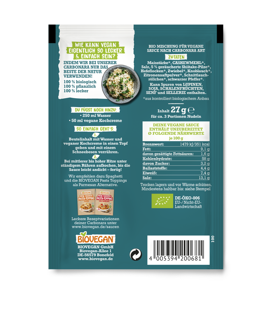 Mit der Biovegan Mischung für Carbonara hast Du in wenigen Minuten eine absolut leckere Pasta Sauce gezaubert. Alles was Du dazu noch brauchst sind 150 ml Wasser und 50 ml vegane Rahmalternative – wir empfehlen Dir die Soya Cuisine von Provamel. Natürlich kannst Du jede andere Pflanzencreme Deiner Wahl dazu verwenden.