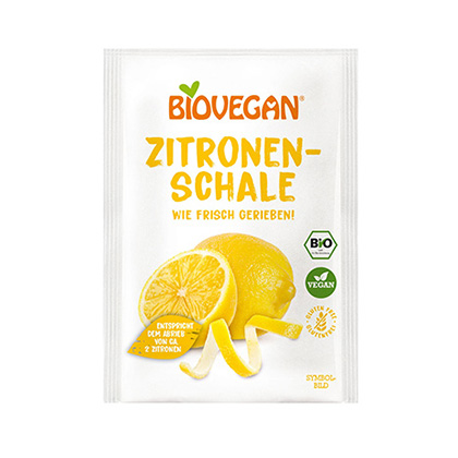 BIOVEGAN Zitronenschale gerieben verfeinert mit ihrer Frische und feinen Säure sonnengereifter Bio-Zitronen auf natürliche und biologische Art all Deine Kuchen, Gebäcke, Desserts, Saucen und Getränke.