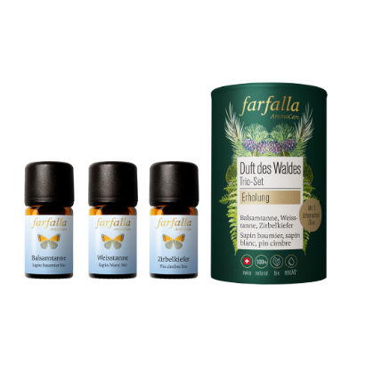 Das hübsch verpackte Set enthält die drei ätherischen Öle Balsamtanne 5ml, Weisstanne 5ml und Zirbelkiefer 5ml.
