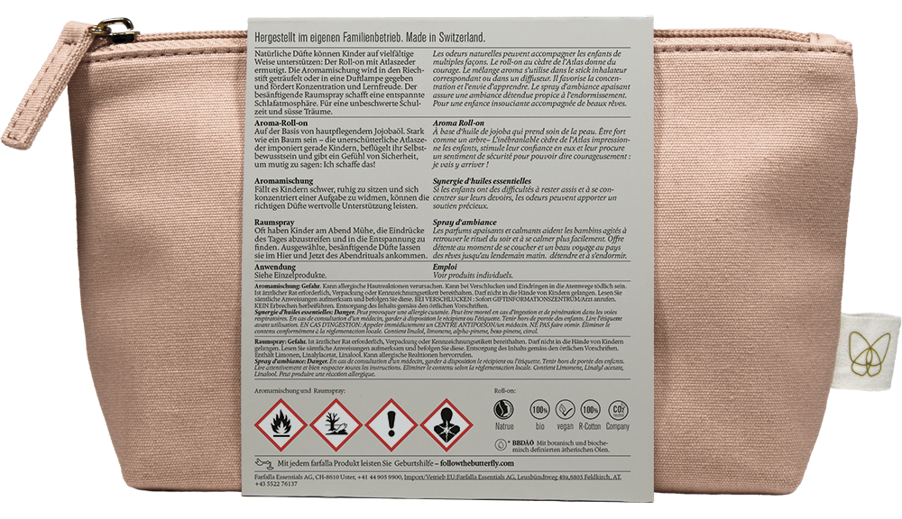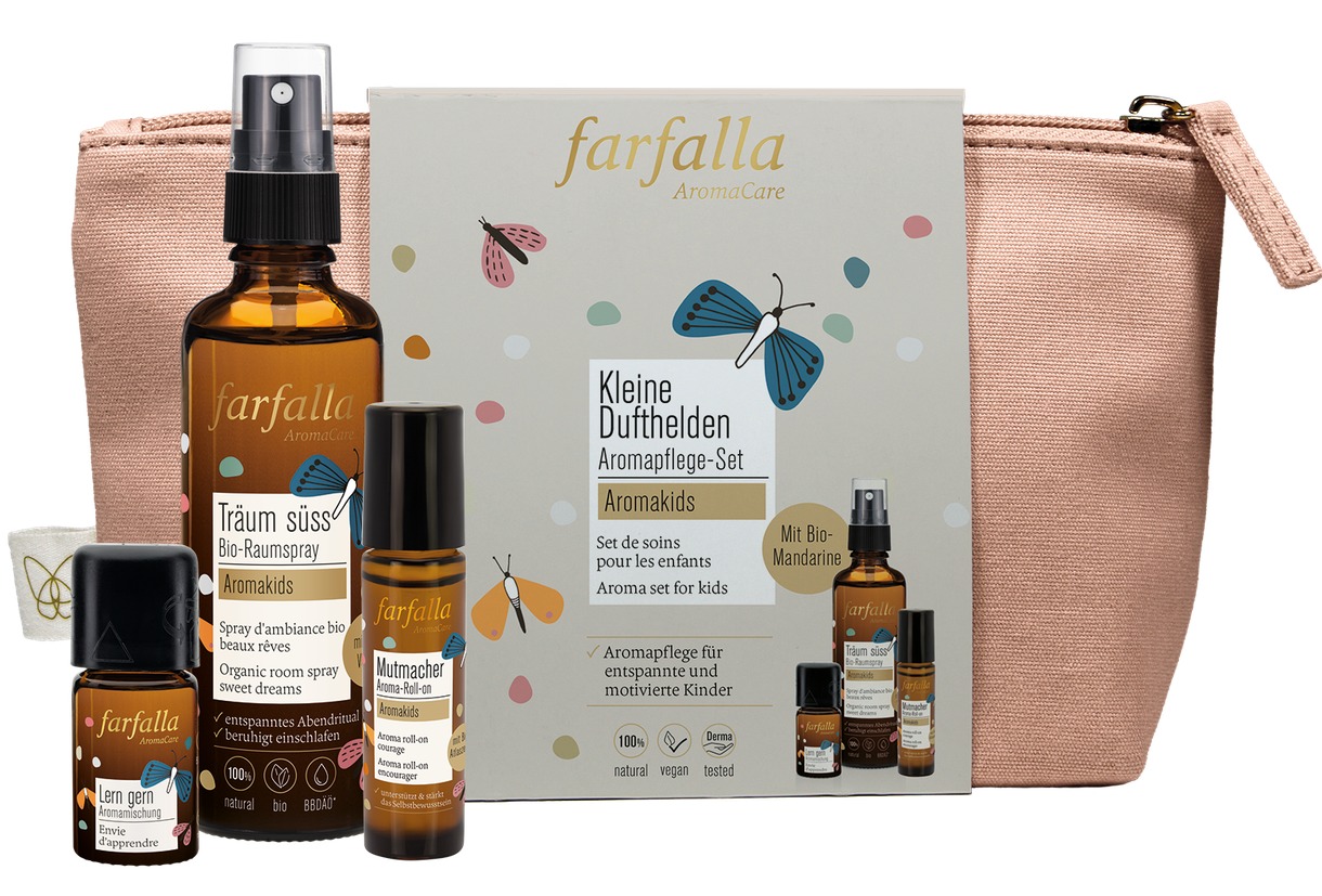 Natürliche Düfte können Kinder auf vielfältige Weise unterstützen: Der Roll-on mit Atlaszeder ermutigt. Die Aromamischung wird in den Riechstift geträufelt oder in eine Duftlampe gegeben und fördert Konzentration und Lernfreude. Der besänftigende Raumspray schafft eine entspannte Schlafatmosphäre. Für eine unbeschwerte Schulzeit und süsse Träume. Inhalt: Bio-Raumspray Süsse Träume, Aroma-Roll-on Mutmacher, Aromamischung Lern gern.
