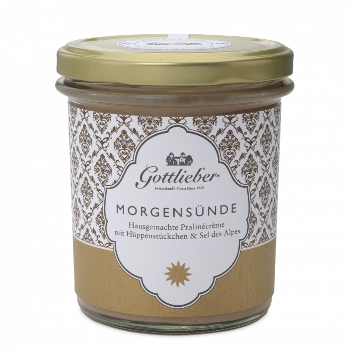 Wenn die hausgemachte Pralinécrème von Gottlieber auf feine Hüppenstückchen und Schweizer Sel des Alpes trifft, dann entsteht der himmlisch süsse Brotaufstrich Morgensünde! Die Basis bildet die feine Praliné Hüppenfüllung. Sie wird von Hand mit knusprigen Hüppenstückchen und einem Hauch Schweizer Sel des Alpes angereichert.