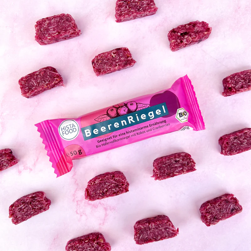Wenn Du Beeren magst und kernige Riegel ebenfalls, dann ist der HistaFood Beeren Riegel vielleicht etwas für Dich. Konzipiert wurde der Riegel von HistaFood für Personen, welche eine Histamin Intolleranz haben. Er ist nämlich histaminarm. Zudem auch gluten- und laktosefrei.