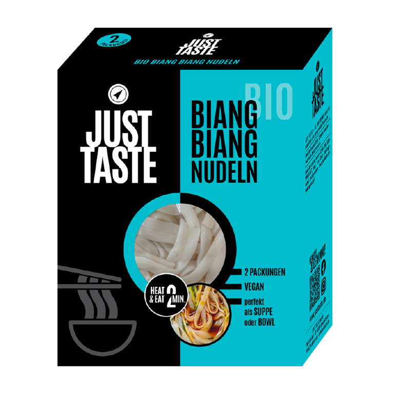 Biang Biang-Nudeln sind traditionelle, handgezogene breite Nudeln. Sie sind ein faszinierender Teil der chinesischen Esskultur mit sogar einem eigenen Schriftzeichen. Ihre Herstellung erfordert wiederholtes Ausrollen und Schneiden des Teigs in Streifen. Traditionell werden diese Nudeln mit einer würzigen Sauce aus Chiliöl, Sojasauce, Knoblauch und verschiedenen Gewürzen serviert. Deswegen gibt es nun auch Biang Biang-Nudeln von JUST TASTE – natürlich in der gewohnten besten Bio-Qualität, ohne Zusatz von Farbstoffen, Geschmacksverstärkern oder ähnlichem.