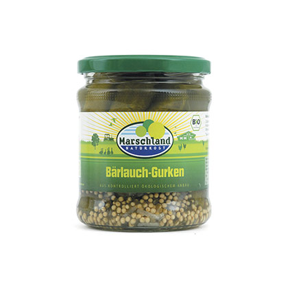 Marschland Naturkost Bärlauch-Gurken sind ein idealer Begleiter für eine deftige Brotzeit, auch als Sandwichbelag oder Einlage in Sauchen oder Dips. Die kleinen knackigen Gurken haben einen würzigen Bärlauch-Geschmack.