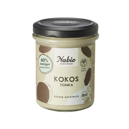 Der Nabio Kokos Tonka Aufstrich enthält 60% weniger Zucker und Fett als herkömmliche süsse Brotaufstriche.