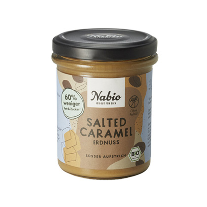 Der Nabio Salted Caramel Erdnuss Aufstrich enthält 60% weniger Zucker und Fett als herkömmliche süsse Brotaufstriche.