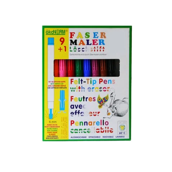 Die Packung enthält 9 Fasermaler und 1 Löschstift mit runder 6mm Spitze.