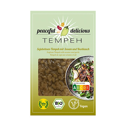 Peaceful Delicious ist ein junges Unternehmen, welches sich der Tempeh-Produktion verschrieben hat. Mit dem Sojabohnen Tempeh mit Sesam und Knoblauch liefert Dir Peaceful Delicious ein bereits köstlich gewürztes und pfannenfertiges Tempeh. Du musst es nur noch in Streifen schneiden und anbraten. Fertig ist der gesunde Tempeh Genuss.