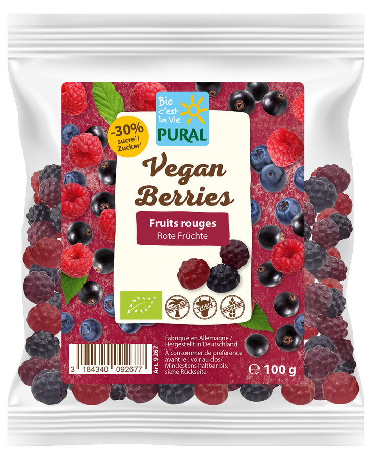 Aufgepasst Ihr Naschkatzen! Wir haben da was für Euch entdeckt: köstliche kleine Beeren-Fruchtgummis die es in sich haben! Sie sehen zuckersüss aus und schmecken auch so – himmlisch süss nach frisch gepflückten Himbeeren, Brombeeren und Heidelbeeren. Dabei enthalten die süssen Früchtchen satte 30% weniger Zucker als vergleichbare Fruchtgummis. Sie sind zart und weich im Biss und werden aus besten Bio-Fruchtsaftkonzentraten und natürlichen Farbstoffen hergestellt, die aus Früchten und Pflanzen gewonnen werden. Die Pural Vegan Berries sind von Natur aus glutenfrei und für eine 100 % vegane Rezeptur, erhalten sie ihre geleeartige Textur durch Pektin.